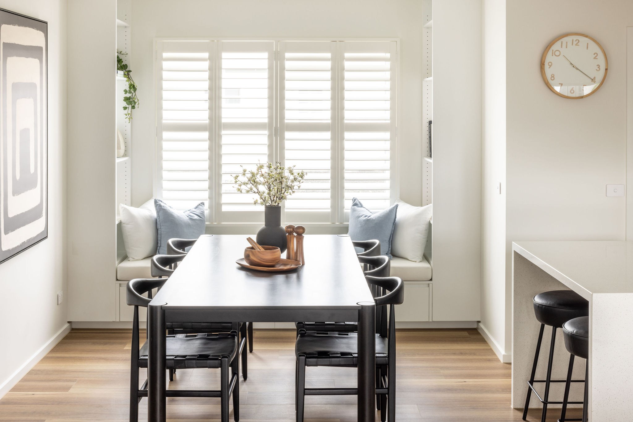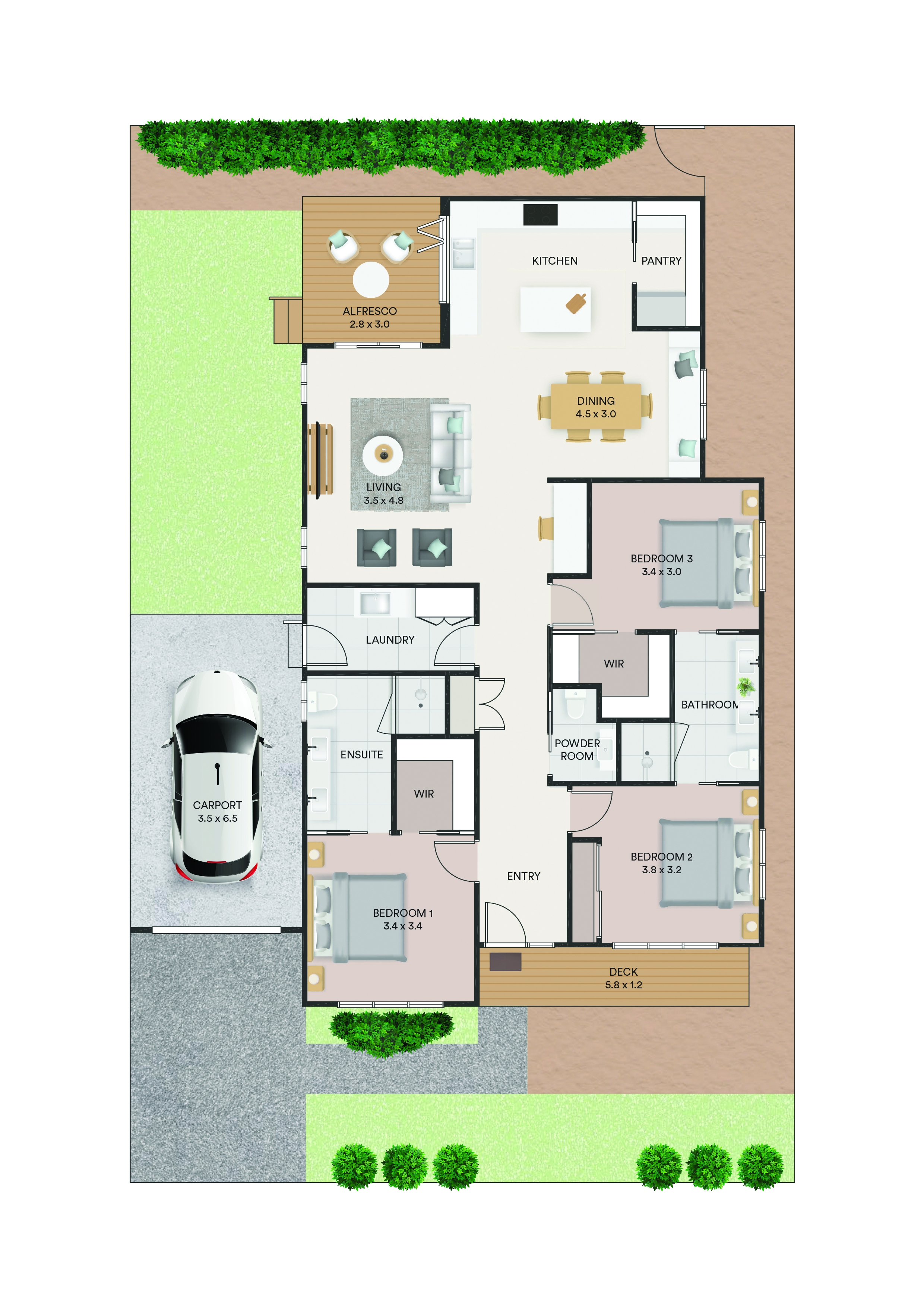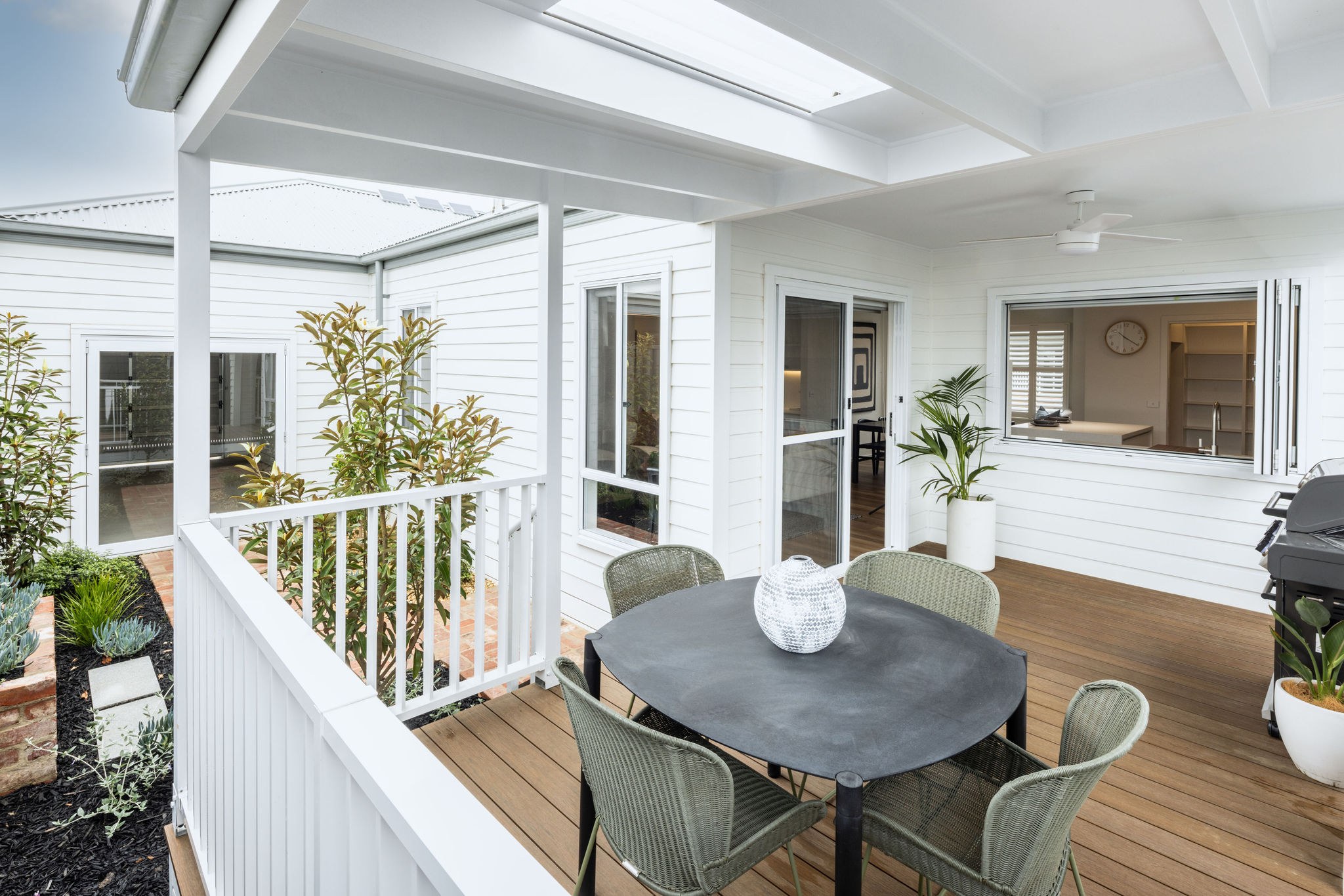 From the moment you arrive, the wide front deck sets a welcoming tone. Bedrooms sit at the front for privacy, while open-plan living flows to the rear alfresco. Street-facing master with ensuite, two guest rooms, window seat, study nook, and bright living with sliding doors and servery window.
