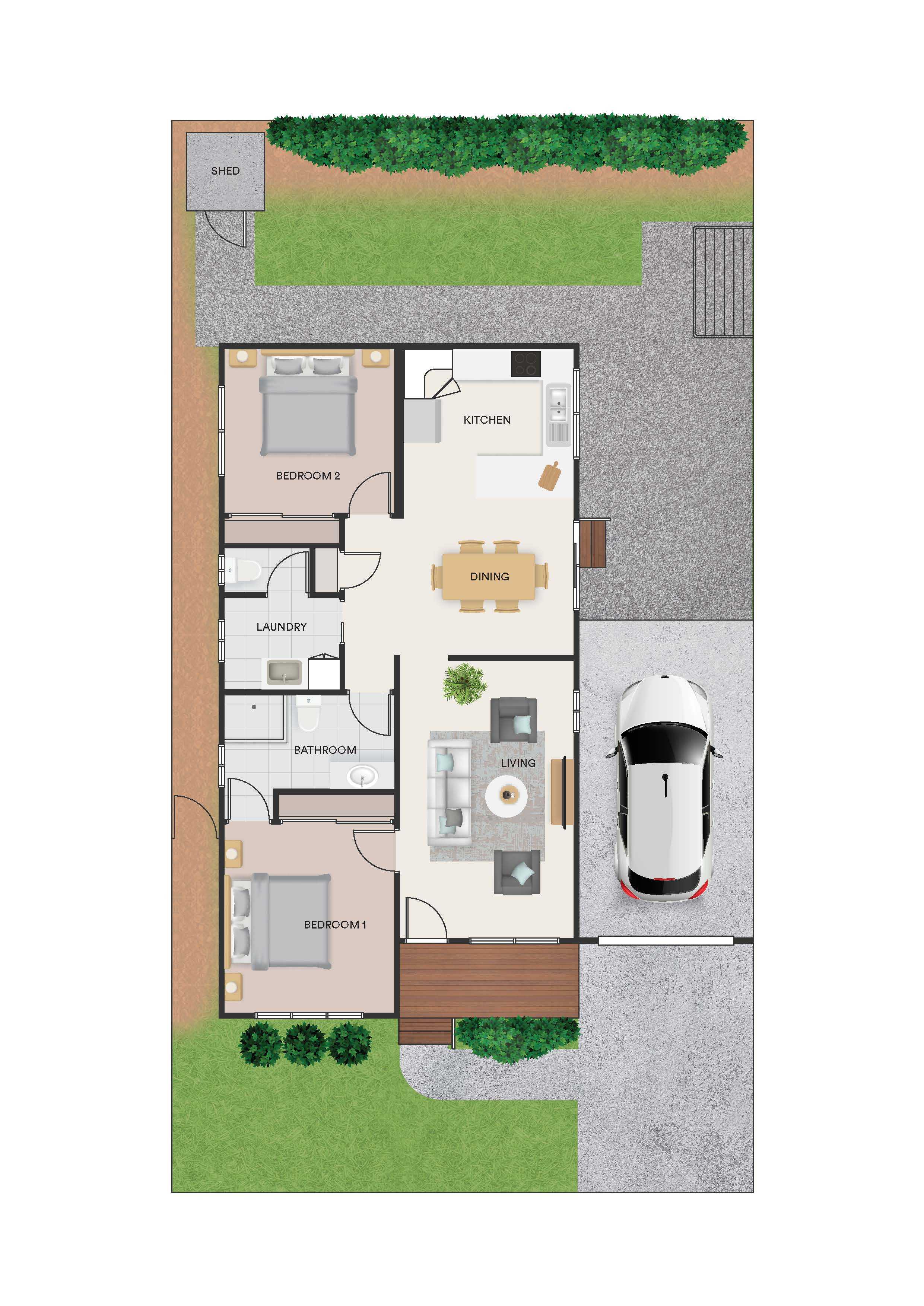 This newly renovated two-bedroom home provides an ideal sanctuary for garden lovers. Situated on an extra-long lot at the back of the community, the rear yard has an established rose garden, artificial turf and plenty of space for a pooch to play.